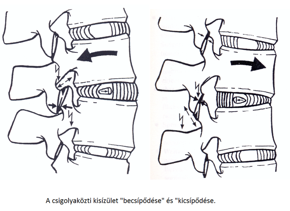 Az ízületi toknak vagy a tok redőjének, vagy a porckorongocskáknak a becsípődése nagyon fájdalmas, és kiválthatja az említett receptor eredetű gerincvelői fájdalom reakcióit, mégpedig az un. álgyöki tüneteket.