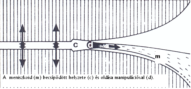 A meniszkoidok nemcsak az ízületi szélek közé csípődhetnek be, hanem elég, ha a vékony ízületi belső un. synovialis hártyába, azaz az ízületi felszínt képező porc külső puhább rétegébe nyomódnak, már emiatt is elakadhat az ízületi mozgás. Ilyen egyszerű a blokkolódás fogalma, és könnyen megérthető a műfogások célja! A gyakorlatban a nehézséget az jelenti, hogy megállapítsuk, az adott panaszt valóban blokk okozza-e, hol van a blokk és hogyan szűntessük meg.